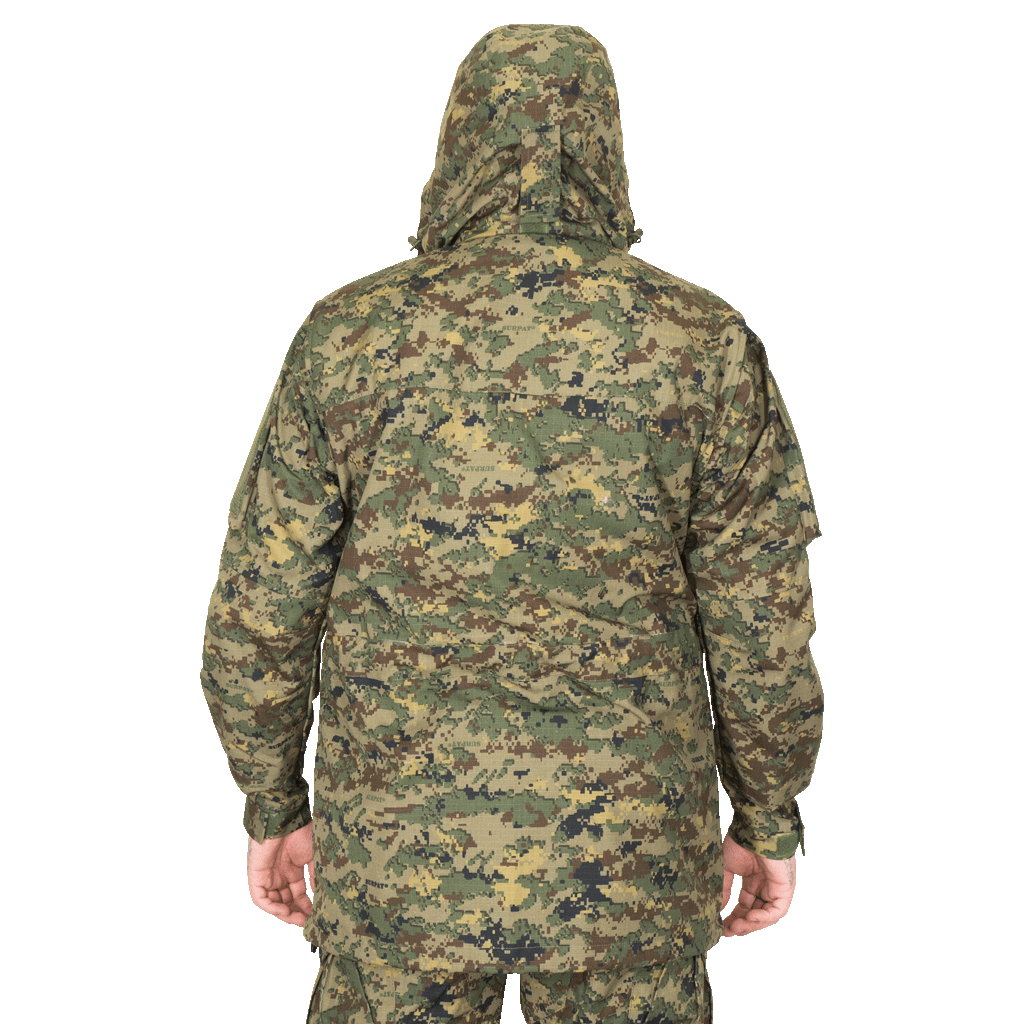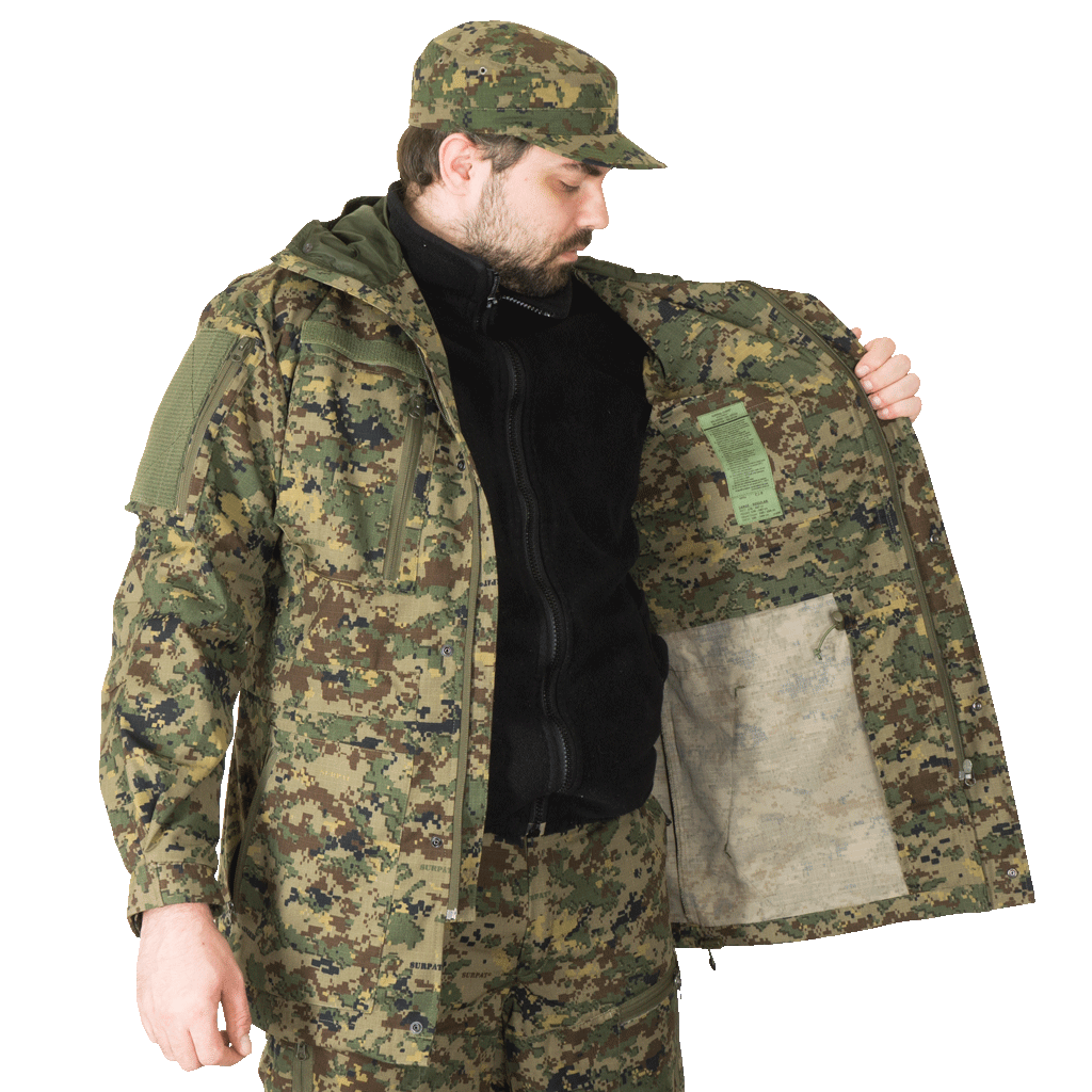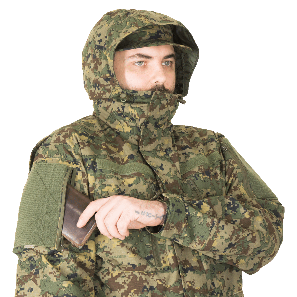 Куртка: ● 2 косых объемных кармана на груди на молнии ● 2 нижних объемных кармана на молнии ● 2 косых объемных кармана для рук ● 2 кармана на рукавах с липучкой для нарукавных знаков ● Липучка на груди для крепления нашивок ● Спереди застегивается на молнию и кнопки ● Не стесняет движения руками за счет специальной треугольной складки в области лопаток ● Все ответственные места на костюме усилены закрепками, сделанными на специальной программируемой машине ● Специальный покрой кармана рукава, не мешающий управлению оружейным ремнем ● Капюшон с регулировкой ● Один внутренний карман для документов ● Регулировка по объему эластичным шнуром на талии и внизу куртки