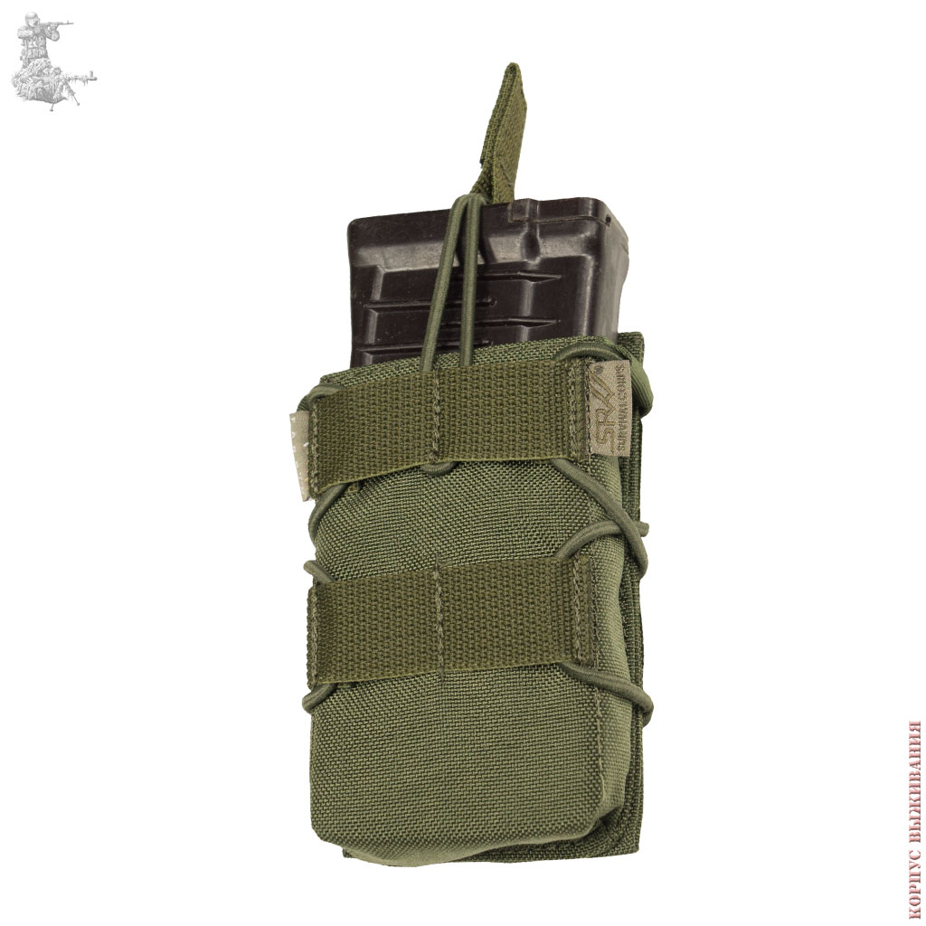 ● Съемный регулируемый эластичный шнур обхватывает подсумок с боков и фиксирует магазин сверху