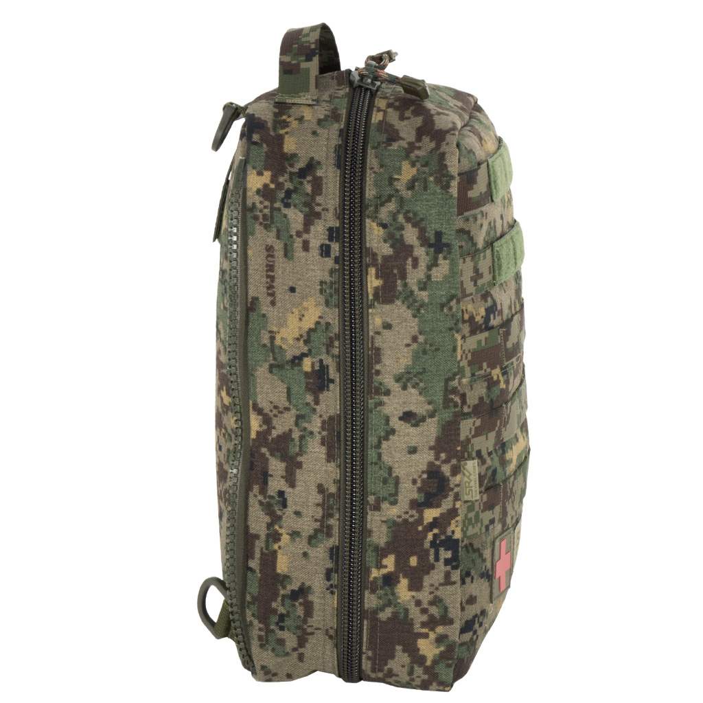Групповой ранец Парамедика Макс. Совместно с военными медиками мы сконструировали универсальный ранец для парамедика на отделение. Делался ранец под конкретное наполнение для оказания первой помощи на поле боя. Конструкция ранца позволяет носить его как рюкзак на лямках и как подсумок на жилете, бронежилете закрепив на спине при помощи ZIP адаптеров. Ранец содержит два больших съемных кармана, два маленьких съемных кармана, съемный органайзер, коробочку для ампул, съемные лямки. Внутри есть два ряда крепления для жгутов и ИПП, два кармана на молнии для оборудования типа шин. Дополнительно можно купить грудную стяжку и ZIP адаптеры для расширения возможностей использования ранца. При помощи ZIP адаптера можно так же прикрепить еще один ранец к внешней панели с MOLLE или прикрепить небольшие аптечки, чехол для ножниц и т д. Наш первый экспериментальный образец прошел тестирование военным парамедиком на учениях.