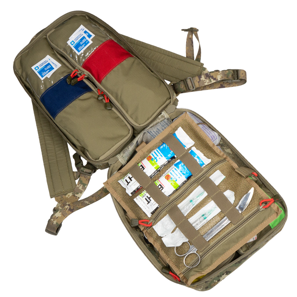 ● Съемные плечевые лямки регулируются по длине ● Быстрый сброс с помощью пластиковых пряжек фастекс на плечевых лямках ● На передней части рюкзака расположены петли M.O.L.L.E. для крепления дополнительного снаряжения ● Основное отделение оснащено креплением сетчатой вставки ● В основном отделении находится органайзер с карманами на молнии и жесткий пенал для 12 ампул ● С внутренней стороны на рюкзаке имеется 2 съемных кармана на молнии для крупных вещей, к которым необходим быстрый доступ ● На передней внутренней части рюкзака расположены два съемных кармана и два кармана на молнии и крепление для жгутов и бинтов ● Крепление для ZIP адаптеров в задней части рюкзака